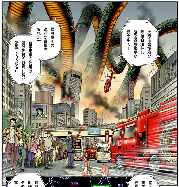 以前記事に書いた『緊急避難指示発令!』のコマはこんな感じになりました(後でまた手を加えるかもしれませんが…)。